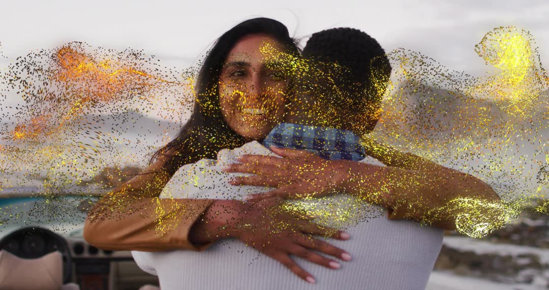 - Romantic Couple Hugging with Sparkling Effects at Scenic Landscape