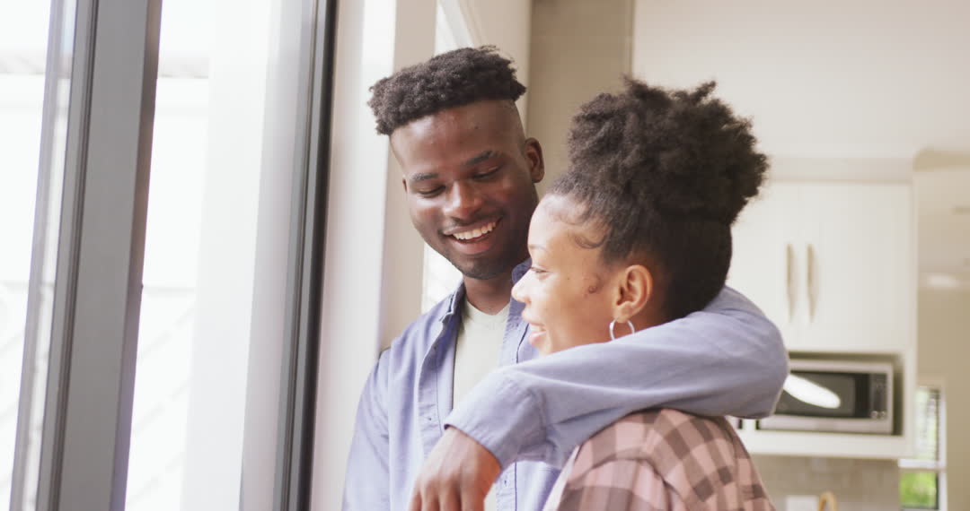 Couple sharing an intimate moment by the window, evoking warmth and affection. Ideal for campaigns focused on love, relationships, or home living.