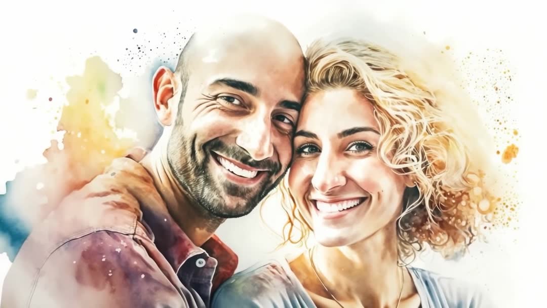 AI Generated Image. A couple is seen leaning close to each other and smiling warmly, expressing romance and affection. The scene is enriched by colorful and artistic watercolor splashes, symbolizing harmony and artistic creativity. This video can be used in promotion of art exhibits, design projects centered around love and relationships, and advertising campaigns focused on emotional wellbeing and romance.