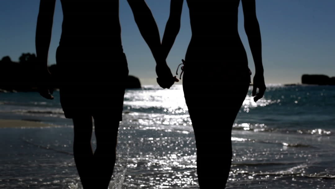 Captures romantic evening scene with couple holding hands by the shimmering ocean. Useful for romantic themes, travel promotions, evening retreats, or lifestyle articles emphasizing love and serenity.