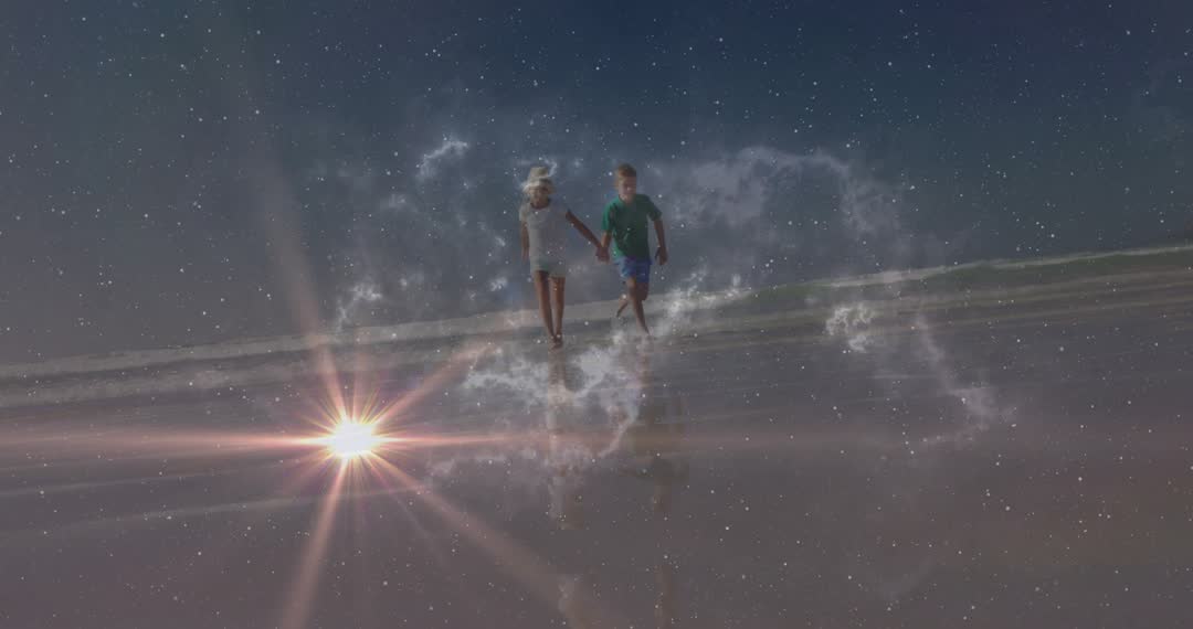 A couple is seen walking hand in hand along a reflective beach with a starry sky overhead. Magical light effects create an ethereal atmosphere, evoking a sense of romance and tranquility. Ideal for themes of love, romance, magical nights, and dreamlike scenarios. This video could be used for romantic-themed advertisements, greeting cards, or travel brochures emphasizing romantic getaways.