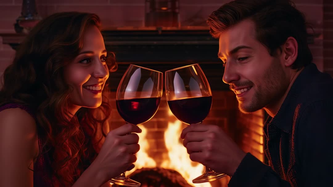 - Romantic Couple Toasting with Wine by Cozy Fireplace