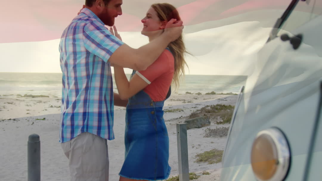 - Romantic Couples Embracing by Seaside with Beach Camper Van