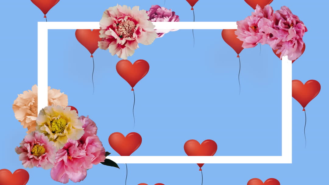 Vivid animation of a white frame adorned with blooming flowers against a backdrop of red heart-shaped balloons floating on a blue background. Ideal for use in designs celebrating romantic occasions like Valentine's Day, weddings, or anniversaries. It adds an artistic and cheerful touch to cards, digital invitations, or festive decorations.