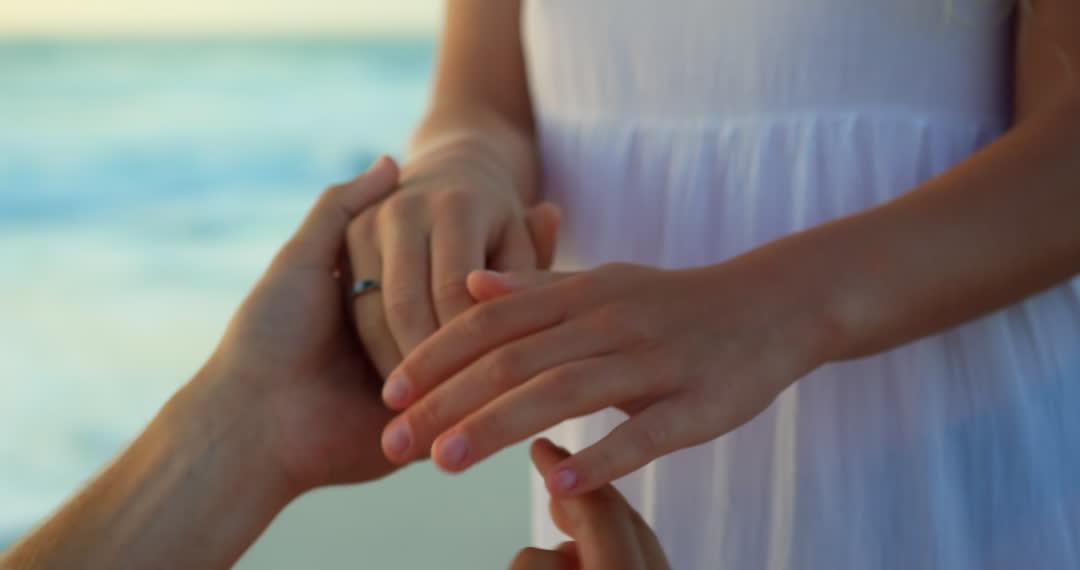 Close-up scene depicts romantic proposal at beach with man placing ring on woman's finger. Ideal for use in engagement announcements, romance-themed projects, or articles about wedding planning and relationships.