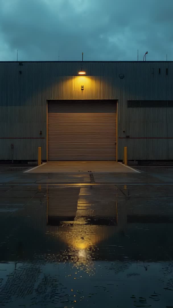 AI Generated Image. Showing roof drip forming rippling puddle and reflecting rollup door and amber lamp against corrugated metal facade. Featuring symmetrical composition with centered rollup door, negative sky space, cool blue tones contrasted with warm lamp glow. Ideal for backgrounds in industrial and logistics videos, intros, social media vertical content, website hero banners, mood boards, safety training, architecture portfolios. Consider adding overlay text in upper sky area or lower reflection area for titles and branding. Working well in film noir or cinematic projects, advertising for warehouse services, urban design presentations, weather or safety campaigns.