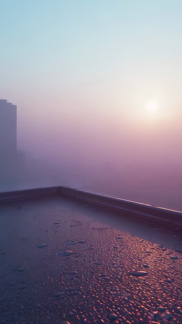 AI Generated Video. Vertical footage showing rooftop parapet with shallow pools reflecting soft rising sun through dense fog, distant tower silhouette fading into pastel dawn haze. Wet metal surface catching warm pink and cool blue highlights, creating cinematic, moody atmosphere and quiet urban solitude. Ideal for background use in mobile hero banners, app splash screens, social stories and reels, meditation and wellness content, cinematic openers, travel or weather segments, and environmental or lifestyle campaigns. Looping stills or slow pan providing ambient motion and mood. 9:16 vertical format suiting smartphone platforms and social video channels, offering instant use for atmospheric intros, title backgrounds, or promotional visuals.