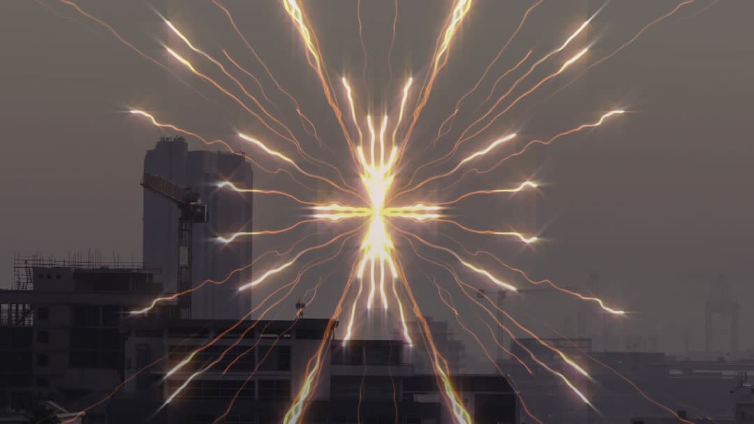 Video showing rooftop starburst radiating golden light rays from central point, pulsing and expanding across hazy urban skyline while cranes and building silhouettes remaining visible. Composition balancing symmetry and chaos, creating striking abstract visual for cinematic sequences. Lighting contrast emphasizing warm glow against muted dusk tones, offering dramatic focal point for titles and overlays. Suiting tech intros, sci-fi openers, music visualizers, broadcast openers, promotional reels, social media backgrounds, event visuals, architectural or urban energy stories. Providing loopable segment for seamless background playback, or enabling extraction of still frames for poster art and motion design elements. Including color grading suggestions: warm highlights with subdued shadows and optional lens flares or particle layers for enhanced depth.