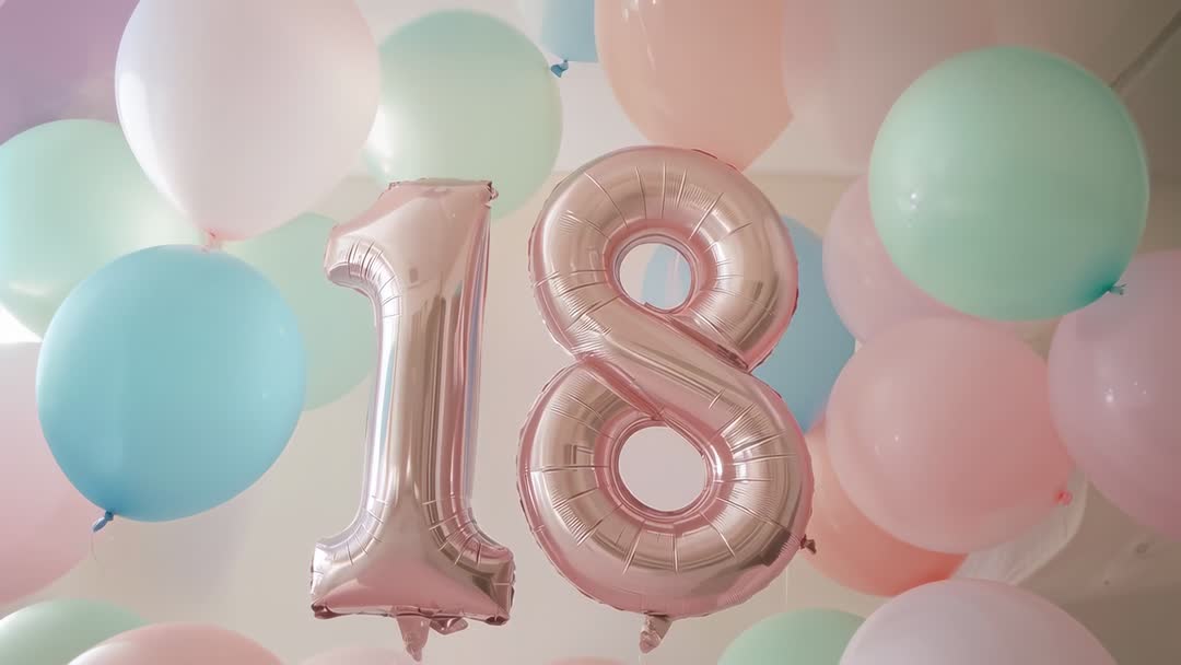 AI Generated Image. Short video clip showing rose gold foil numbers 1 and 8 floating and gently swaying among pastel latex balloons in indoor party room. Camera capturing reflective highlights and soft lens flare across metallic surfaces, creating dreamy celebratory mood. Featuring pastel color palette of blush, mint, and sky-blue that complements rose gold accent. Useful for 18th birthday invitations, coming-of-age promotions, milestone event marketing, social media reels, party planning websites, and e-commerce banners. Clip working well as background for animated text overlays, slow-motion sequences, or promotional intros. Clip offering centered subject with negative space for text overlays and cropping friendly for square and vertical formats.