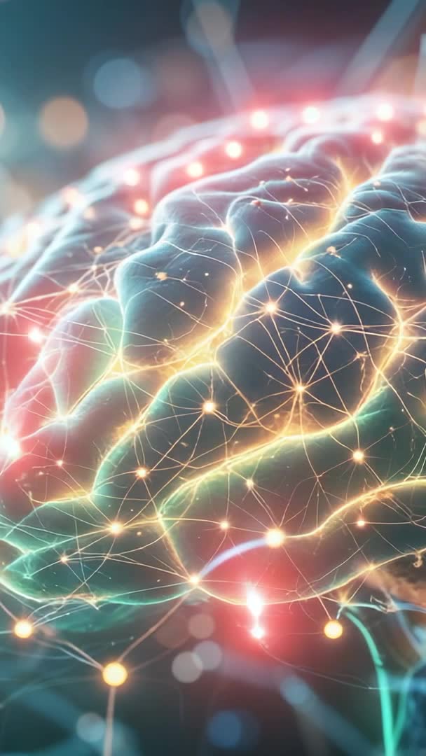 AI Generated Image. Video showing rotating 3D brain model with glowing neural network pulsing along cortex folds. Lighting effects highlighting synapse connections and signal pathways, producing dynamic sense of data flow and connectivity. Color palette combining neon teal and warm gold with soft bokeh and depth of field. Loop-friendly 9:16 vertical clip, high-resolution motion graphic suitable for 4K and HD displays. Working well as background for neuroscience presentations, medical lectures, research explainers, biotech marketing, AI product demos, and tech conference openers. Ideal for social media content, serving as vertical hero on Instagram Stories, Reels, TikTok, mobile app intros, and portrait digital signage. Helping illustrate neural connectivity, brain function, AI networks, and data visualization while enhancing visual impact of presentations, websites, and advertising.
