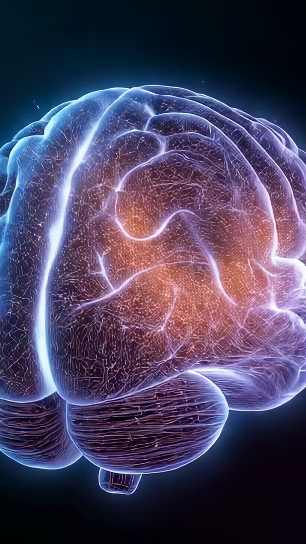 AI Generated Image. Showing rotating 3D brain revealing intricate neural network with glowing orange pulses traveling along neural pathways. Combining futuristic neon palette with high-detail anatomical structure and subtle motion to create immersive neuroscience visualization. Emphasizing cortical folds, cerebellum contours, and dense synaptic web for scientific or conceptual storytelling. Working well for medical presentations, neuroscience lectures, research promos, biotech product launches, technology company intros, mobile-first social ads, and conference openers. Supporting overlay text, logo reveal, lower thirds, and voiceover. Designed as vertical format optimized for mobile platforms and social stories with loop-friendly motion for repeated playback.