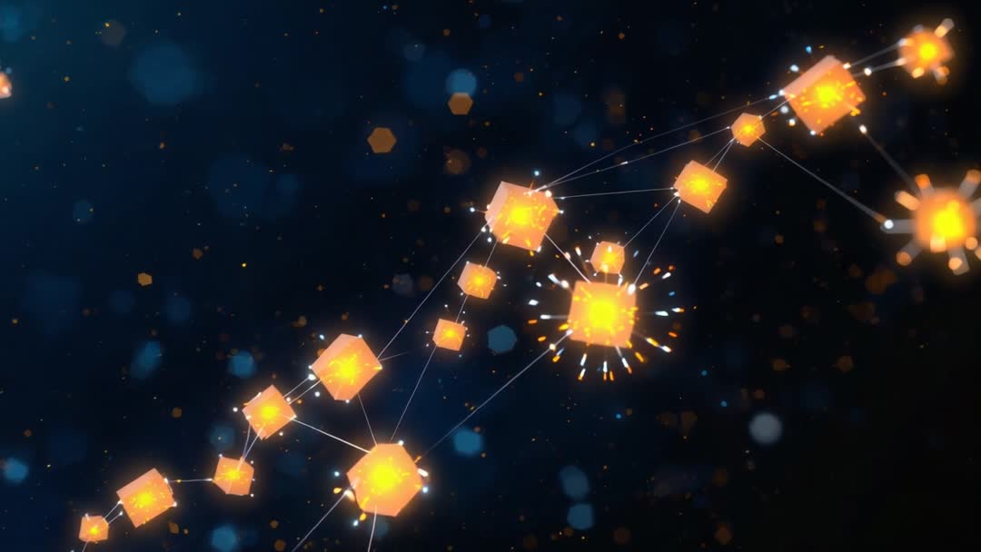 AI Generated Image. Clip showing rotating chain of glowing amber cubes linked by thin filaments against deep navy background. Cubes pulsing with bright core light and emitting sparks along connecting threads, creating dynamic sense of data flow and network activity. Composition featuring shallow bokeh highlights and floating particles, adding depth and cinematic feel. Use cases: suiting technology presentations, illustrating blockchain transactions or neural network concepts, enhancing website hero banners and startup pitch decks, providing animated background for product demos and corporate explainer videos, working well for social media ads and sci fi trailers, supporting educational content about data visualization and connectivity. Clip fitting for overlays, looped backgrounds, title sequences, and stock motion graphics. Color grading options: keeping warm amber tones or shifting to cool cyan for alternative mood. Composition leaving negative space on left for text or logo placement.
