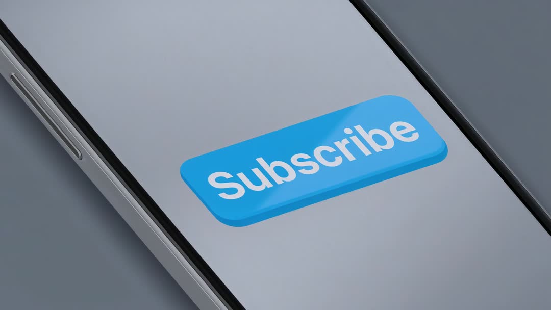 AI Generated Image. Video clip showing rotating and panning camera over smartphone, emphasizing blue Subscribe button against gray glossy surface. Shot presenting close-up diagonal composition, generous negative space for overlay text and branding. Useful for app promotion, subscription campaign, onboarding tutorial, social media ad, UX presentation, website hero, email marketing header. Suitable for mobile UI demos, CTA testing, product showcase, motion design templates, explainer videos. Visual elements featuring smooth rotation, subtle sheen on tabletop, realistic glass screen reflections, glossy device frame, vibrant blue 3D button. Recommended usage: overlaying headline and call-to-action text, creating animated intros, illustrating subscription flow, enhancing blog or tutorial thumbnails. Color palette and composition supporting modern tech and marketing themes. AI-generated scene offering clean, high-contrast visuals ready for editing and compositing.