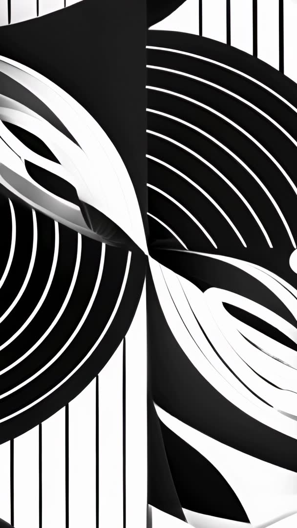AI Generated Image. Video showing rotating concentric arcs and tilting leaf-like forms moving across black canvas, creating hypnotic optical illusion. High-contrast black-and-white composition featuring smooth looping motion, crisp geometric lines, and rhythmic stripes. Suiting vertical social media stories, music visualizers, VJ loops, fashion and tech promos, mobile wallpapers, gallery projections. Including intro and transition backgrounds for product showcases, website hero banners, presentation backdrops, and motion design portfolios. Allowing color grading, speed ramping, and overlaying text or logo for branding. Loop-ready format enabling seamless playback for long displays.
