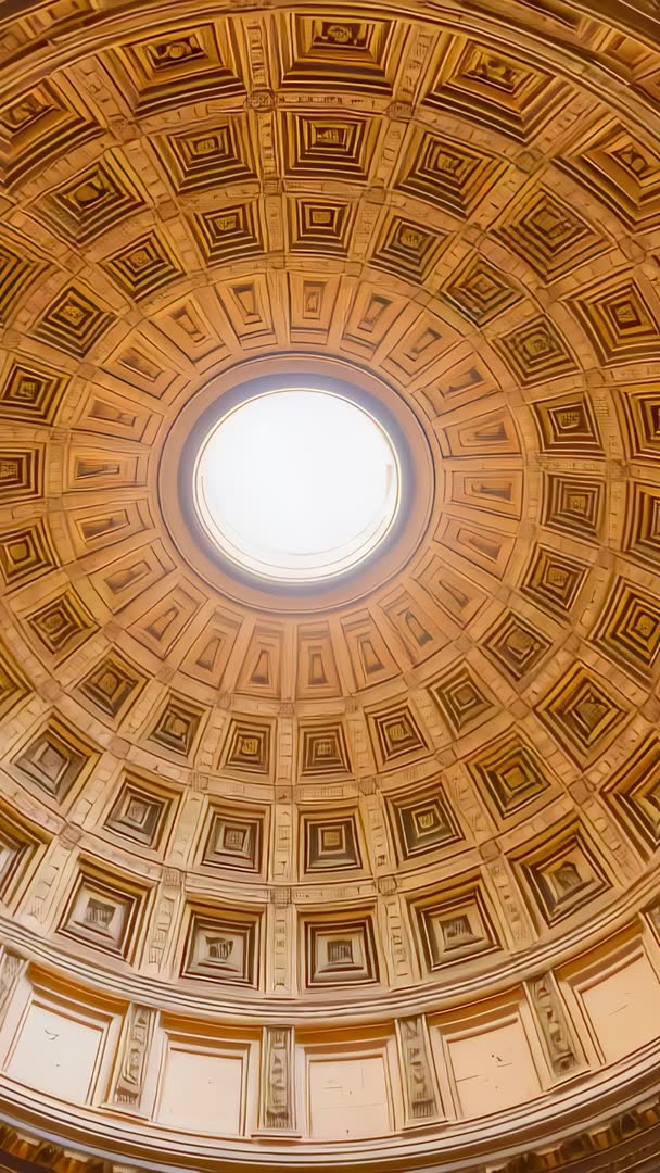 AI Generated Image. Vertical video showcasing rotating camera movement around classical dome, revealing concentric coffered panels and bright central oculus. Warm golden light casting deep shadows across geometric coffers, enhancing symmetry and three-dimensional depth. Working well as establishing shot for architectural documentaries, travel promos, museum and heritage segments, virtual tours, and historical education. Suitable for social media vertical reels, cinematic openers, title backgrounds, and loopable backgrounds for branded content. Suggested postproduction: slow speed ramp, gentle color grade emphasizing warm tones, subtle vignette to draw focus to oculus, and ambient orchestral or reverent drone sound to heighten grandeur.