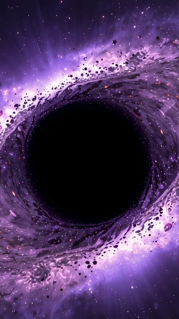 AI Generated Image. Featuring rotating black hole at center, pulling debris and gas into glowing purple accretion disk and feeding singularity. Offering dramatic cosmic visuals with high contrast between dark core and luminous nebula, creating strong cinematic impact. Working well as loopable vertical clip for social media reels, app intros, mobile wallpapers, and streaming platform promos. Allowing easy overlay of titles, logos, and UI elements in top and bottom safe zones for marketing and UX compositions. Suggesting color grading toward deeper violets and adding subtle particle glow or lens flare for enhanced sci-fi feel. Supplying 9:16 orientation optimized for smartphone screens, planetarium clips, educational astronomy segments, and futuristic motion design projects.