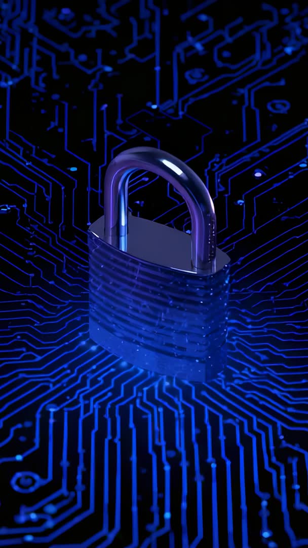 AI Generated Image. Vertical video featuring rotating blue padlock pulsing where glowing circuit traces converge, conveying cybersecurity, encryption, network protection. Visual style emphasizing neon blue lighting, reflective metal lock surface, high-tech circuit pattern, creating futuristic trustworthy mood. Use in marketing videos, app intros, social media stories and reels, website hero sections, corporate presentations, cybersecurity training modules, product demos, tech news segments, ad spots. Loopable motion working well as background animation behind headlines and call-to-action overlays. Pairing with bold sans-serif typography, minimal copy, pulsing sound effects for enhanced impact. Optimized for mobile vertical playback, 9:16 aspect ratio, autoplay muted environments.