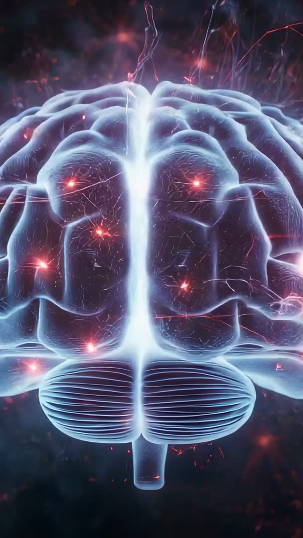 AI Generated Image. Rotating vertical 3D brain model showing translucent cerebral surface with glowing neural nodes and pulsing electric filaments inside dark void. Camera moving from top to base while soft light tracing neural circuits and synapse points lighting up in rhythmic pattern. Color palette combining cool blues and warm red highlights creating high-contrast futuristic look. Serving neuroscience education videos, medical presentations, research explainers, biotech startup pitches, AI and neural network demos, conference openers, social media vertical reels, app intros, website hero banners, and futuristic documentaries. Offering loopable background for mobile-first campaigns and flexible source for color grading, speed ramping, overlay text, or branded motion graphics. Supplying visually engaging centerpiece for storytelling on cognition, innovation, neurotechnology, and data connectivity.