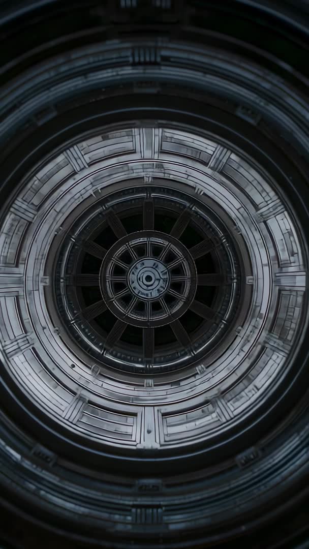 AI Generated Video. Vertical video showing rotating camera aligning toward central industrial hub surrounded by concentric metallic rings and bolted panels. Motion revealing layered circular structure, radial spokes, and intricate metalwork with cool blue-gray tones and high contrast lighting accenting texture and depth. Visual working well for tech and engineering themes, including product launch openers, industrial process presentations, sci-fi title sequences, and vertical social ads. Styling allowing easy looping for ambient background, adding mechanical sound design, speed ramping for dramatic reveal, and overlaying animated graphics or logos. Frame providing versatile crop for smartphone and portrait platforms while retaining central symmetry.