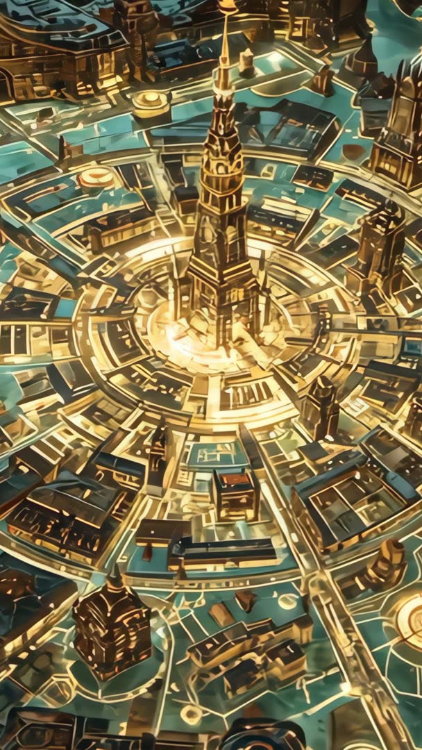 AI Generated Image. Featuring rotating camera movement around golden spire, unfolding concentric plaza rings, and neon-gold highlights across radial roads in futuristic cyberpunk city. Suiting vertical social videos, mobile app promos, title sequences, and looping backgrounds for music visuals. Enhancing tech presentations and product launches by providing cinematic top-down view of digital metropolis. Offering strong geometric composition and center focal point for overlaying text, logos, and UI elements. Delivering seamless loop potential for short-form platforms such as Instagram Reels, TikTok, and YouTube Shorts. Providing high-resolution vertical format, compatible with motion design, VFX, and game trailer projects. Ideal for branding, advertising, concept trailers, and editorial features exploring future urban landscapes.