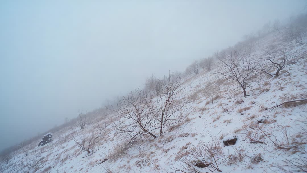 - Rotating Camera Revealing Leafless Shrubs on Snow-Dusted Moorland under Heavy Fog