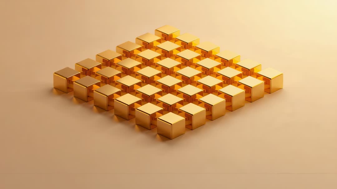 AI Generated Image. Camera rotating while lights moving, revealing centered gold cube grid on warm beige backdrop. Reflective metallic surfaces catching highlights and casting soft shadows, creating depth and luxurious feel. Minimalist composition using geometric repetition and gentle gradient tones, evoking modern architecture, high-end branding, and technology themes. Ideal for website hero loops, social media ad backgrounds, product reveal scenes, broadcast idents, presentation openers, and motion graphics overlays. Clip working well with text overlays, logo animations, color grading, and seamless looping for continuous playback. AI generated CGI render offering clean reflections and easy masking for compositing.