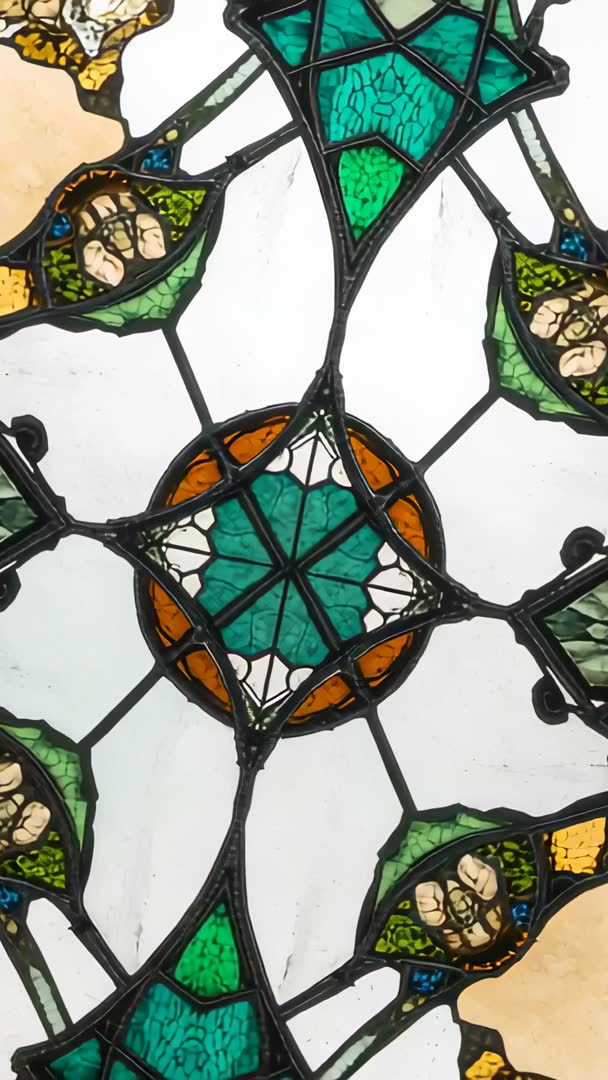 - Rotating camera revealing teal rosette in backlit stained glass mosaic vertical video