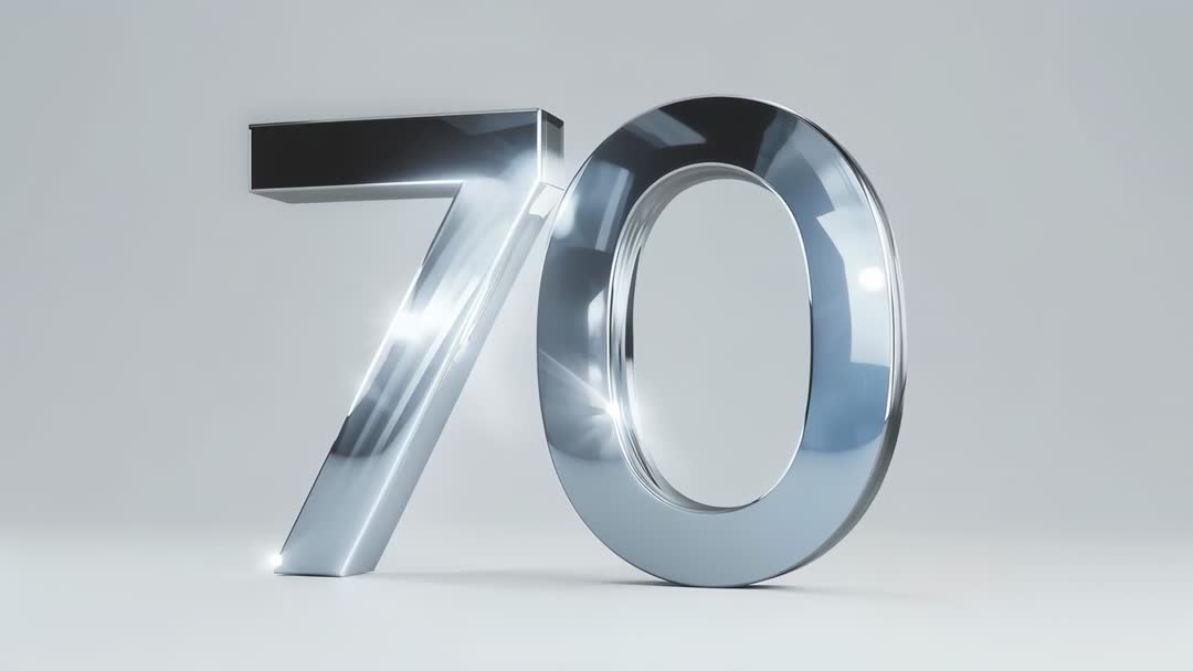 AI Generated Image. Video showing rotating chrome numeral 70 on minimal pale gray studio floor while moving lights sweep across surface creating sharp glints and soft reflections. Camera performing slow dolly and slight rotation to enhance three-dimensional presence and mirror highlights. High-contrast highlights and muted background drawing attention to sculptural form and material finish. Ideal for 70th anniversary, milestone celebration, corporate anniversary, luxury product launch, or countdown opener. Clip fitting broadcast intros, social media promos, website hero banners, event invitations, livestream overlays, and presentation slides. File working well as loopable background or layered with graphic text, logo placeholders, lower thirds, and animated transitions. Color palette neutral silver and gray supporting overlay text and brand colors while maintaining elegant, modern feel.