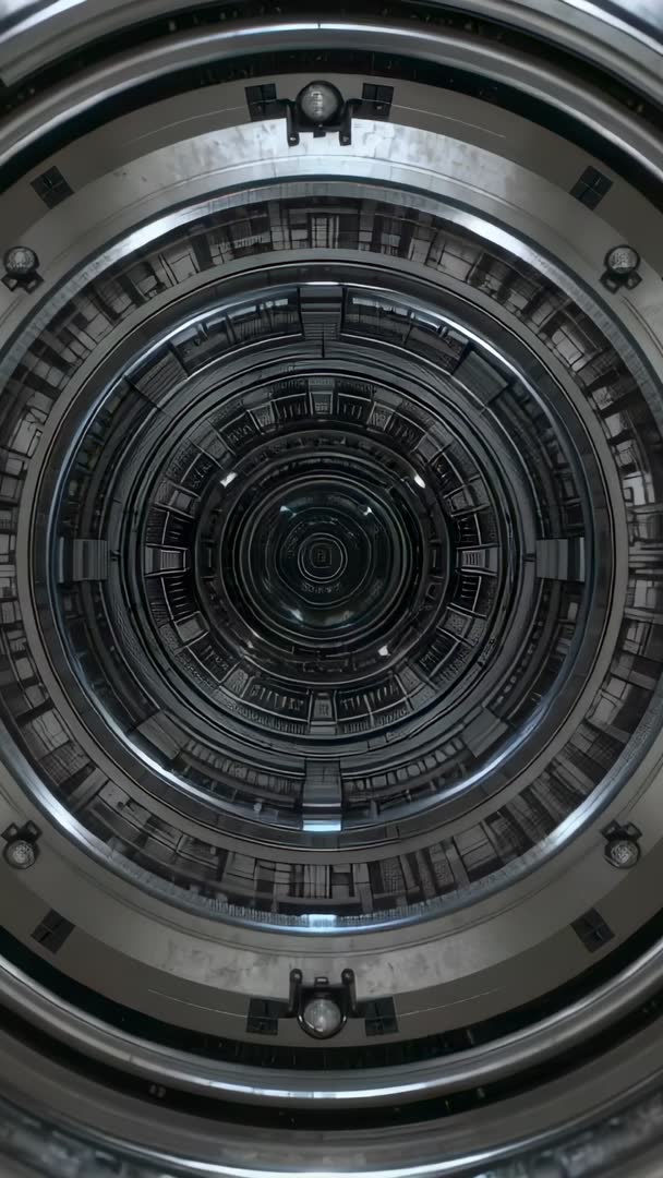 AI Generated Video. Showing rotating concentric metal rings inside industrial cylinder, camera shifting slightly from center, lights glinting off polished steel surfaces and bolts. Emphasizing symmetry, depth, and reflective textures while rings revolve in slow, hypnotic motion. Perfect for tech promos, sci-fi intros, industrial branding, product reveal sequences, motion graphic overlays, mobile vertical ads, social reels, VR experiences. Use as loopable background for titles and lower thirds or as dynamic transition between scenes. Recommend color grading toward cool metallic tones, adding subtle lens flare and ambient sound design for immersive feel. Orientation vertical for seamless integration into Instagram Reels, TikTok, Snapchat stories, portrait digital signage. High contrast, symmetrical composition providing strong focal point for text or logo placement at center. Suitable for engineering presentations, manufacturing demonstrations, futuristic UI concepts, corporate technology campaigns. Technical notes: looping friendly, slow rotation speed, minimal camera shift, crisp detail in bolt and ring textures.