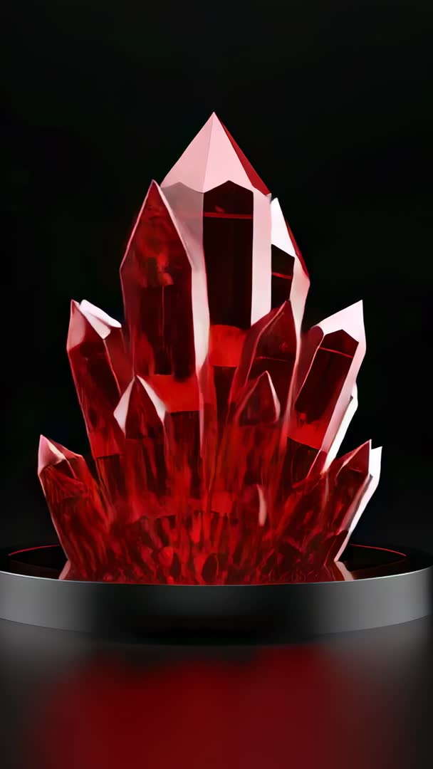 AI Generated Video. Video showing rotating crimson crystal cluster on black base under cinematic studio lights, highlighting sharp facets, glossy surfaces, and deep red transparency. Shot in vertical format and optimized for mobile and social content, clip offering smooth motion and loop-friendly composition. Use for luxury product intros, jewelry promos, mobile app backgrounds, music video overlays, fantasy or sci-fi title sequences, meditation or wellness visuals, and game UI elements. Post-production suggestions: apply slow-motion loops, add subtle glow or particle effects, adjust color grade for cooler or warmer tones, crop for Instagram Stories or TikTok. Suitable for high-resolution motion graphics, advertising, and editorial features needing striking gemstone or jewel-themed visuals.