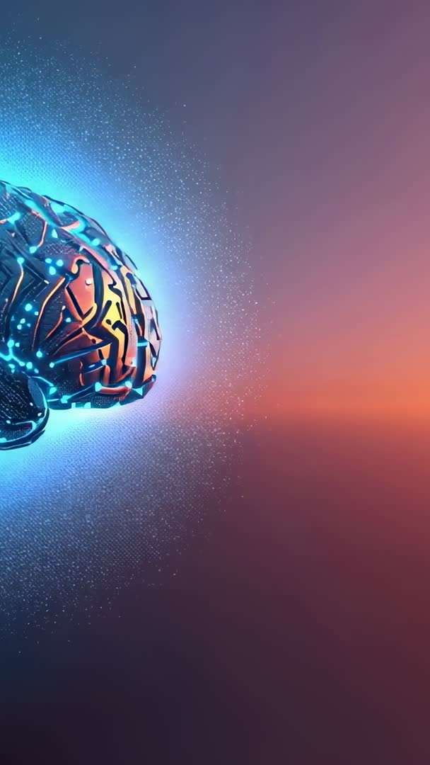 AI Generated Image. Showing rotating cybernetic brain drifting across gradient horizon while neon circuitry pulsing and glowing, creating high-tech focal point. Providing cinematic vertical composition with ample negative space for text overlays, lower-third graphics, and call-to-action elements. Serving well for technology presentations, AI concept videos, startup pitch decks, social media vertical ads, app intros, and motion graphics backgrounds. Offering vivid color contrast and dynamic motion for animated logo reveals, website hero sections, and product launch teasers.