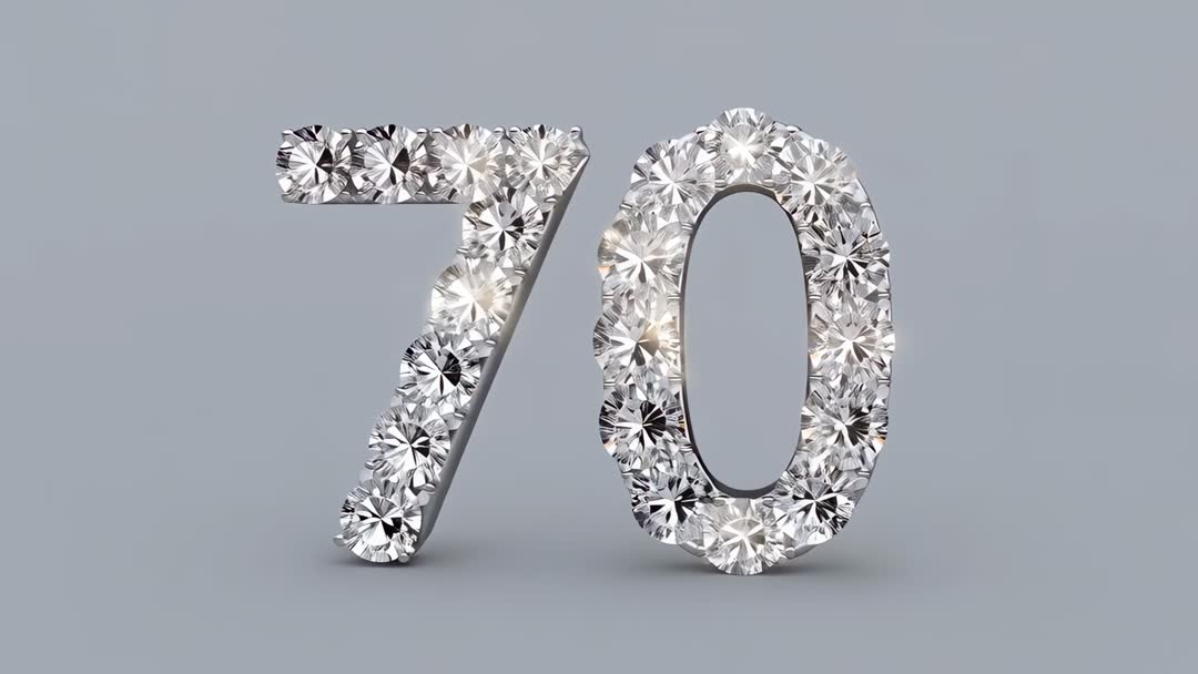 - Rotating diamond-encrusted 70 numeral sparkling on neutral gray floor