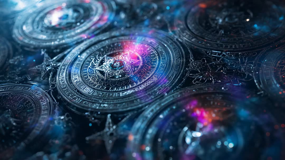 AI Generated Image. This video frame shows a rotating disc with star inscriptions emitting a blue glow, scattered with brightly colored neon particles. Set within a tech chamber, it creates a captivating cyberpunk and digital atmosphere. This abstract visual could be used as a background in sci-fi stories, futuristic-themed projects, or to inspire AI-generated art themes. It would also be perfect for creative inspiring concepts or futuristic design presentations.