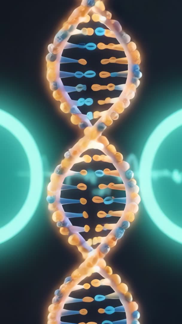 AI Generated Image. Vertical video showing rotating DNA double helix inside neon lab GUI, glowing waveform displays pulsing in background. Color palette combining warm amber and cool cyan to create high-tech contrast and futuristic mood. Smooth 3D animation featuring detailed molecular bonds, subtle depth of field, and slow continuous rotation. Loop-friendly vertical format optimizing for smartphone screens and social platforms. Usage ideas: enhancing biotech branding, supporting genetics explainer videos, opening medical research presentations, powering startup pitch decks, creating app intros and social media vertical ads. Creative uses: background for science podcasts, visual for educational modules on DNA structure, overlay for data visualization and bioinformatics dashboards. Technical notes: clean animation with clear focal point and adjustable color grading for seamless integration.