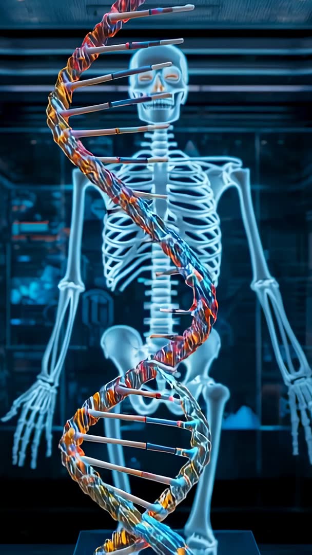 AI Generated Image. Showing rotating DNA helix spiraling upward inside futuristic lab with translucent human skeleton and digital panels in background. Featuring vivid bi-color lighting and smooth 3D animation, providing modern scientific mood for biotech and healthcare projects. Ideal for use in social media reels, mobile ads, educational explainers, medical conference openers, product demos, website hero backgrounds, and science documentaries. Vertical video format optimized for mobile platforms and short-form content. Suggested edits: add voiceover explaining DNA alignment, overlay animated labels for gene annotation, loop segments for continuous background, apply brand color grading and text overlays for messaging. Licensing ideas: use for biotech marketing, research presentations, e-learning modules, and futuristic visual design.