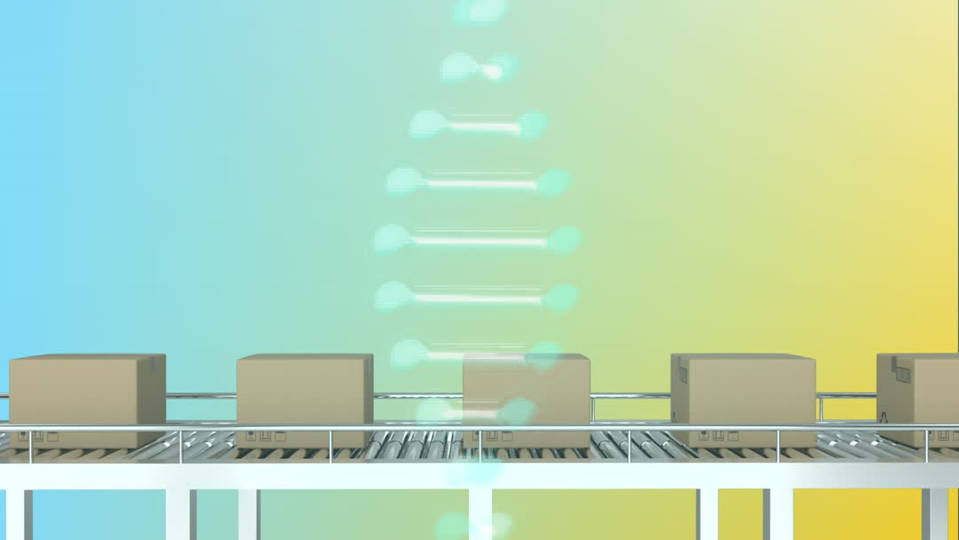 - Rotating DNA Hologram Over Factory Conveyor Belt with Packages