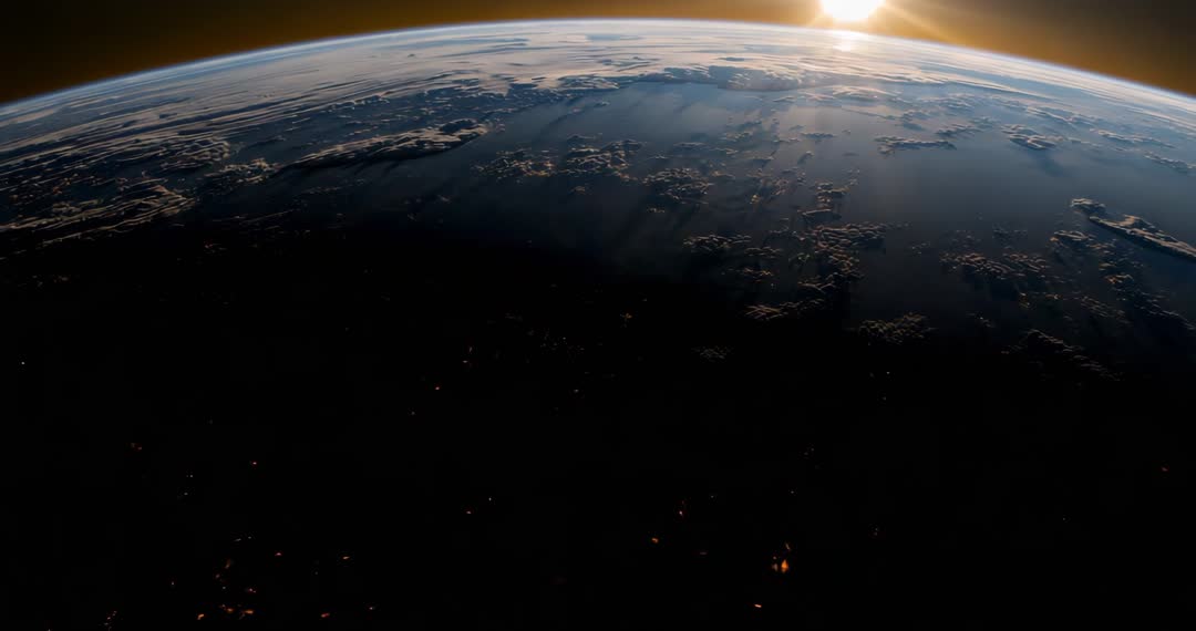 AI Generated Image. This video captures a breathtaking view as Earth rotates into night, showcasing both the natural beauty of the transition of day to night and the sparkling city lights on the surface. The video highlights the terminator line that divides day and night, offering glimpse of how planet looks from a vast, cosmic perspective. Ideal for use in educational content about Earth and space, documentaries on astronomy, or visual experiences emphasizing the wonder of our planet and its natural processes.