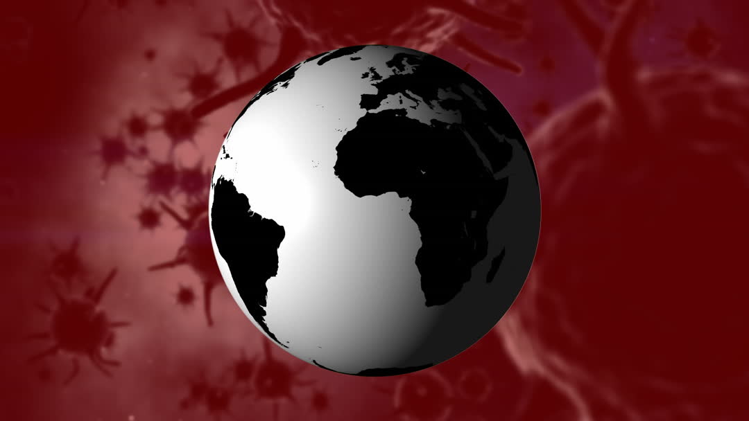 A digital animation shows the Earth rotating against a vivid backdrop of biological cells, possibly illustrating global health or the spread of diseases. Vibrant colors with a metallic-textured globe emphasize healthcare themes. Ideal for use in medical or educational content about globalization, biological studies, world health updates, scientific displays, or background visuals for presentations.