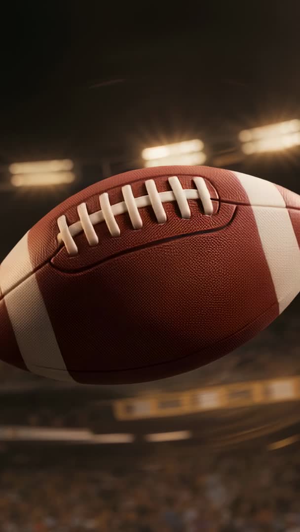 AI Generated Video. Vertical video showing rotating football zooming toward camera under stadium lights, close-up on white laces and textured leather surface, dynamic rotation and flight motion with blurred crowd background. Cinematic lighting and shallow depth of field emphasizing stitching and grip detail. Ideal for sports broadcast opens, social media reels, mobile ads, game day promos, and highlight reels. Use as loopable background for scoreboard overlays, countdown graphics, or sponsor slates. Recommend pairing with energetic soundtrack, slow-motion segments for dramatic effect, and bold lower-third text for team name or score. Provided in 9:16 aspect ratio optimized for vertical platforms and quick editing into multi-platform campaigns.