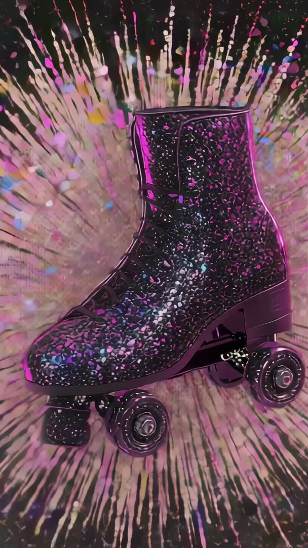 AI Generated Video. Rotating glitter quad roller boot showing close-up of textured sequin finish, wheels and toe stop against exploding confetti and neon magenta burst. Lighting creating reflective highlights and color shifts across boot surface, producing high-energy disco look. Ideal for product demo, social media ad, TikTok or Instagram Reel, e-commerce hero video, fashion campaign, event promotion, party or disco promotion. Recommend looping short clip, adding upbeat disco or synth track, using quick cuts and animated text overlays, optimizing for vertical 9:16 delivery. Use slow-motion detail frames for texture, add extra glitter particle overlays for enhanced sparkle, keep color saturation high for vivid eye-catching result. Suitable for online storefronts, promotional banners, lifestyle blogs, influencer content, and TV or streaming fashion segments.