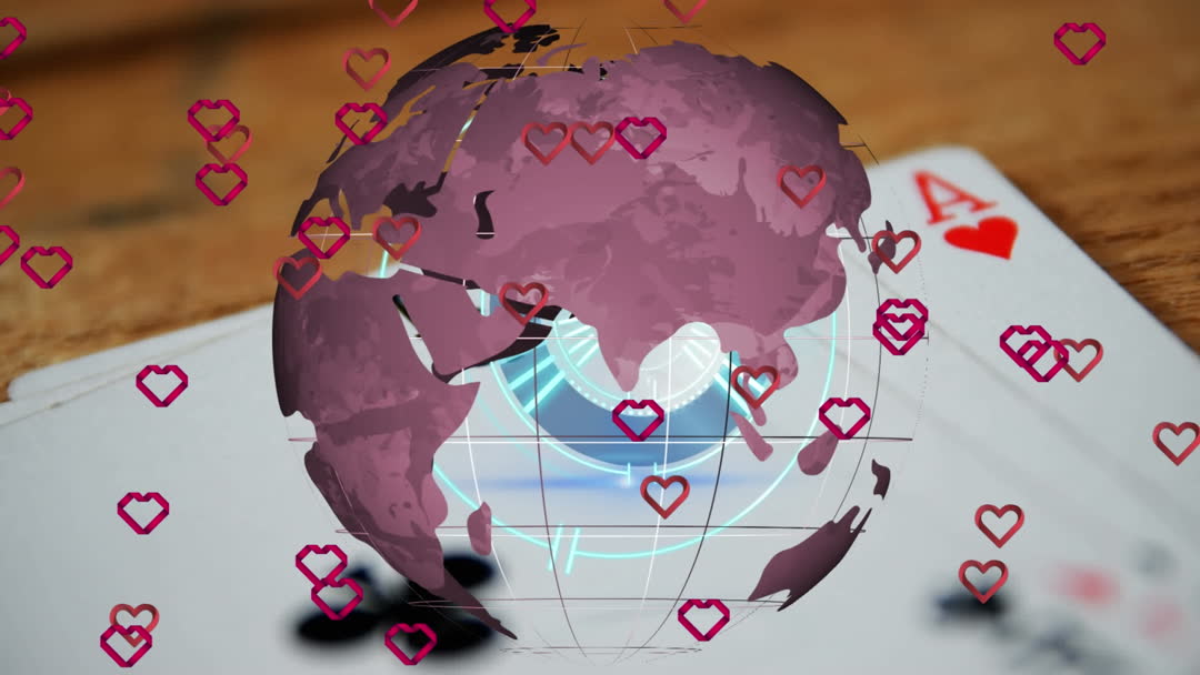 Visual featuring rotating globe symbolizing worldwide connectivity studded with floating hearts. Perfect for love and travel-related content, illustrating global romance or gift exchanges. Playing cards add a playful, enigmatic twist, useful in themes of chance or worldwide adventure.