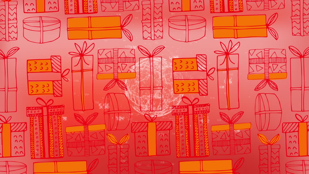 This illustration presents a striking combination of a rotating globe amid a vivid red background decorated with various gift box drawings. It visually embodies global connectivity and commerce, perfect for use in advertising holiday sales, promotions, or digital network innovations. Its festive appeal also suits holiday-themed websites and global gift-related content.