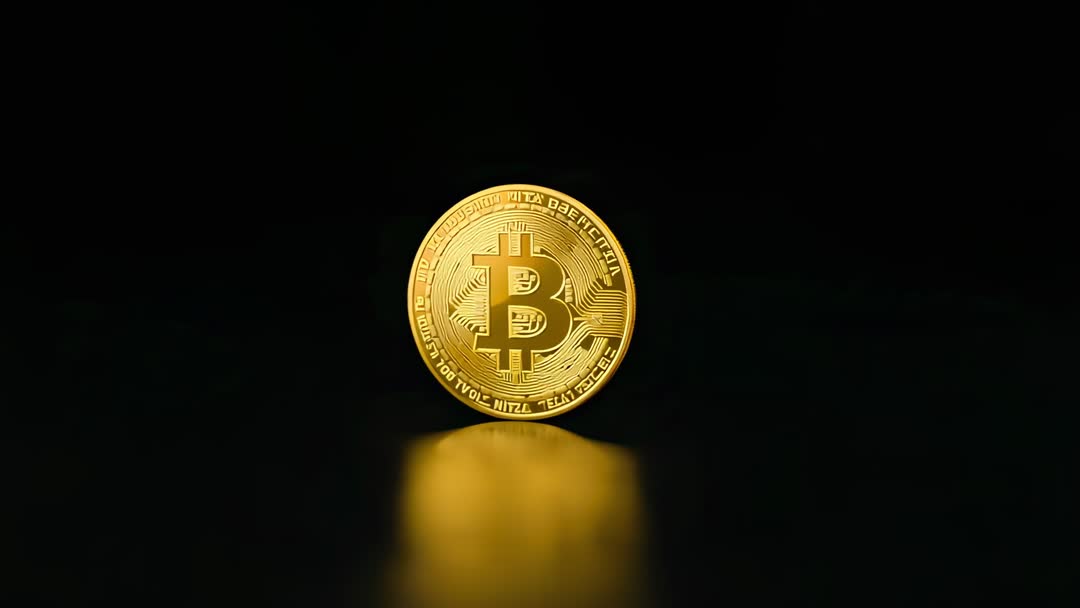 - Rotating Gold Bitcoin Coin Vibrating on Dark Shiny Surface Under Warm Studio Light