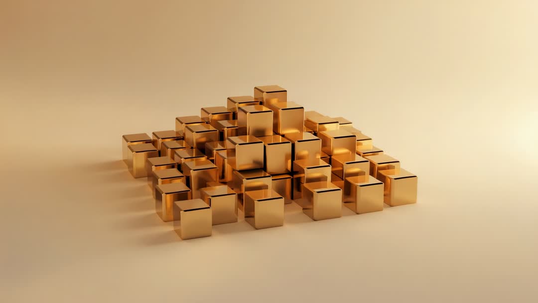 AI Generated Image. Video showing rotating gold cubes arranged in grid, rising and falling to form stepped pyramid on reflective plane under warm studio lighting. Cubes reflecting light and casting soft shadows, creating minimalist luxury mood. Camera performing slow orbit revealing geometry and depth while subtle glinting highlights animate across surfaces. Motion designed for seamless looping and short cinematic intros. Use for website hero banners, corporate brand openers, product reveal animations, technology or finance presentations, luxury packaging promos, social media ads, broadcast bumpers, and gallery installations. Supports color grading, speed adjustment, and logo insertion. Ideal for background loops, title sequences, stock motion libraries, and NFT or blockchain visuals.