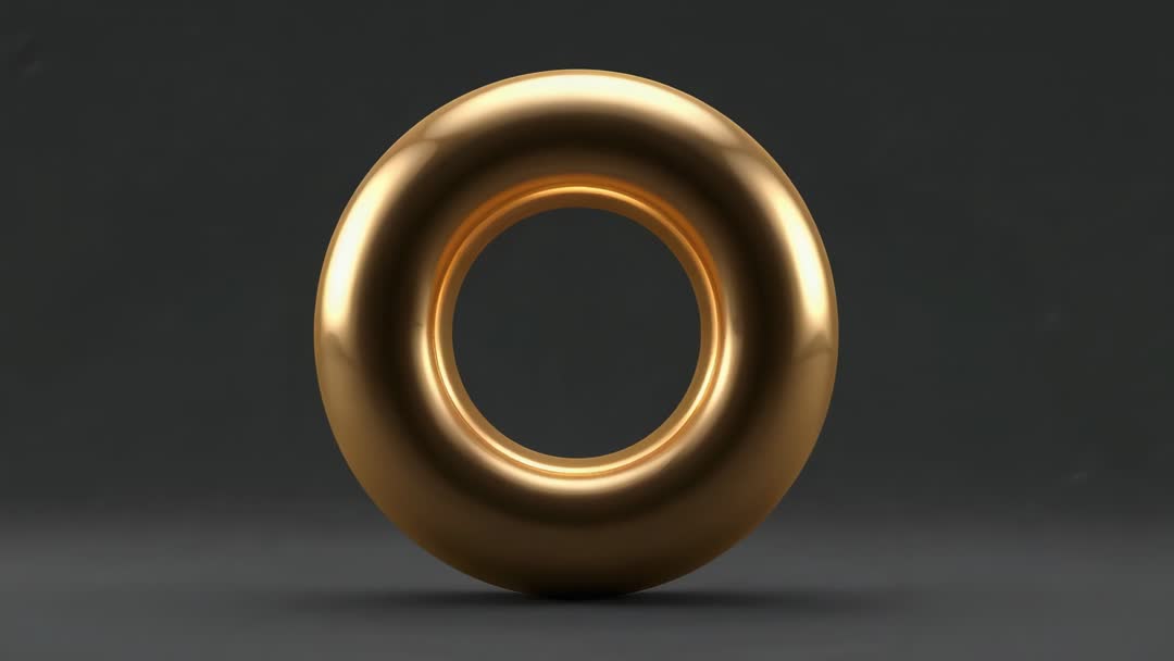 AI Generated Image. Looping 3D animation showing rotating polished gold torus on dark matte surface, camera slowly dollying in while shifting highlights across curved metal, creating cinematic reflections and depth. Composition keeping torus centered with soft rim light and subtle floor shadow for clean minimal look. Render quality delivering realistic metal shader and smooth motion ideal for seamless looping. Use for luxury brand idents, product reveal sequences, website hero backgrounds, motion graphics, title cards, social media ads, jewelry commercials, fintech branding, NFT promotion, UI transitions and abstract visual intros. Provide color and material variations by swapping gold for chrome, bronze or colored anodized finishes to match project palette.