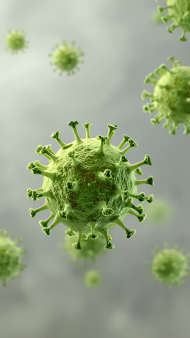 AI Generated Image. Showing rotating green viral particle with spike proteins drifting through fluid in closeup microscopic 3D render. Serving medical presentations, news reports, public health campaigns, educational modules, social media vertical reels, broadcast bumpers, background loops. Demonstrating virus structure, infection mechanisms, vaccine communication, laboratory visuals, disease prevention tips. Offering vertical format and loop-ready design for seamless insertion into short-form content; compatible with editing software for overlay text, voiceover, infographic elements. Allowing color grading and scale adjustment to match brand guidelines and editorial needs.