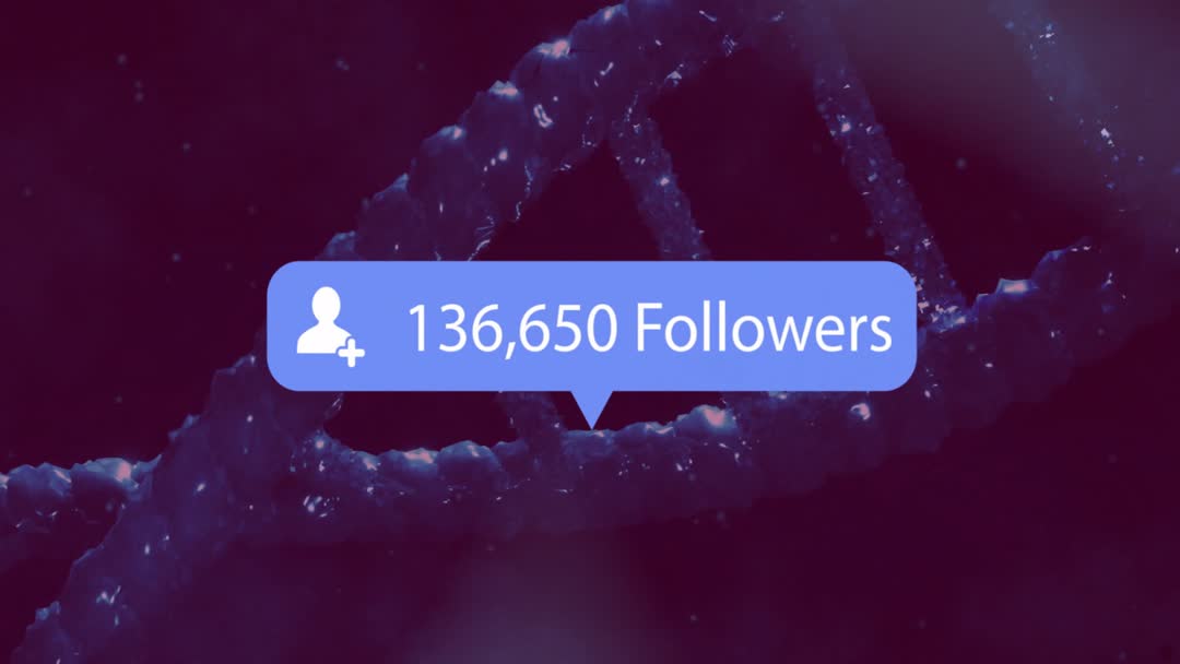 This dynamic visual combines digital and biological elements to depict growth and innovation. The rotating helix and increasing follower count suggest a blend of high-tech advancements with modern social trends, making it suitable for presentations about technology, digital marketing, biotech innovations, and futurism. Great for use in content about the intersection of biology and digital media.