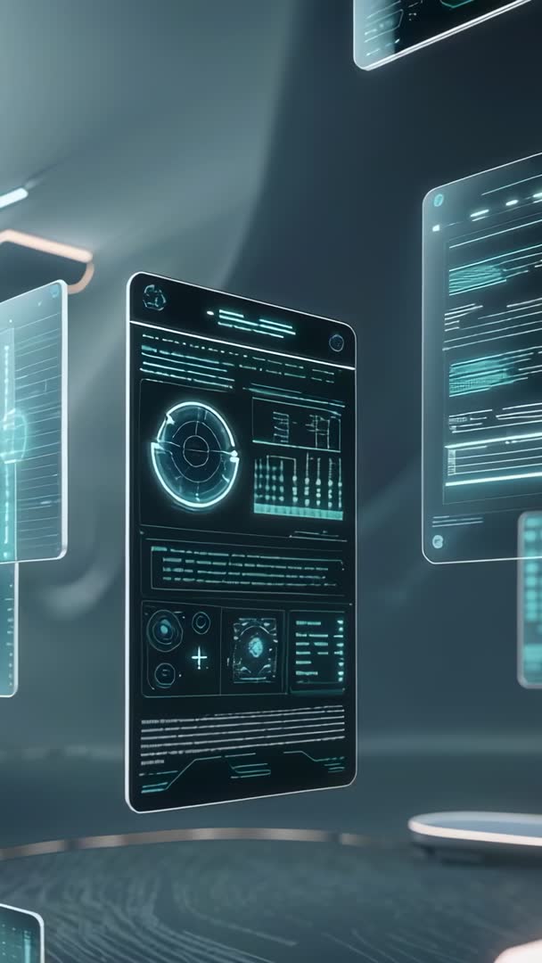 AI Generated Video. Showing rotating holographic panel displaying analytics charts, graphs, and interactive neon UI elements in futuristic lab environment. Serving as background footage for app launches, cybersecurity campaigns, AI marketing, VR and AR concept videos, and product demos. Offering high-contrast teal neon palette and cinematic atmosphere for clear focus on dashboard elements. Pairing with on-screen text overlays, voiceover narration, and motion graphics to highlight metrics, KPIs, or feature walkthroughs. Fitting vertical orientation for mobile-first platforms such as stories, reels, and short-form social ads. Available for licensing in commercial projects including websites, commercials, training modules, and investor pitches. Suitable for creative agencies, tech startups, enterprise teams, and educational content producers exploring future tech or data-driven themes.