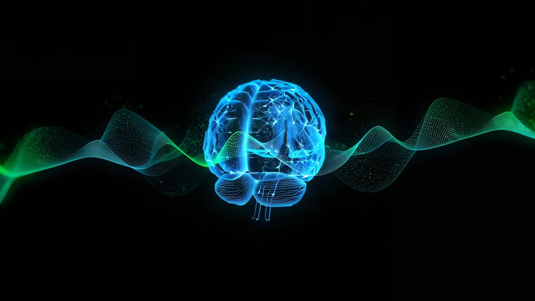 - Rotating holographic brain animation pulsing to waveform with neon neural network glow