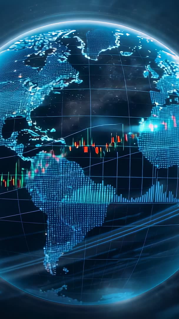 AI Generated Image. Rotating holographic globe showcasing live candlestick charts, moving average lines and volume histogram overlaid on digital world map. Neon-blue data points and gridlines pulsing to emphasize active market movement. Candlestick patterns updating in real time while trend lines tracking price direction across regions. Camera panning slowly to reveal different market indicators and regional activity. Suitable for finance channel intros, fintech product demos, trading platform promos, market analysis segments and vertical social ads. Enabling seamless loops and background use in presentations, mobile stories and website hero sections. Suggested edits: add voiceover or lower-third text, sync with electronic soundtrack, adjust color grade to match brand palette, overlay logo in corner, crop for 9:16 vertical format.